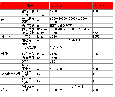 三向電動前移式叉車 DM_TR120/150產品描述:采用ZAPI新型全交流控制器、德國進口ZF變速箱,高效率,低噪音;是一款多功能、高適應性車型,完全滿足窄巷道,寬巷道及平臺的使用要求;貨叉的上升、下降、左移、右移、左旋、右旋等功能都在手動模式下完成;在自動模式下,通過人機界面能實現貨物存取準備、高度定層等操作;在滿足縱向定位的條件下,還可實現自動存取貨;人機界面在本機上不僅作為一種輸入設備,而且還能實時顯示轉向輪、貨叉的方位及貨叉的橫向位置及高度、貨物的重量等數據;